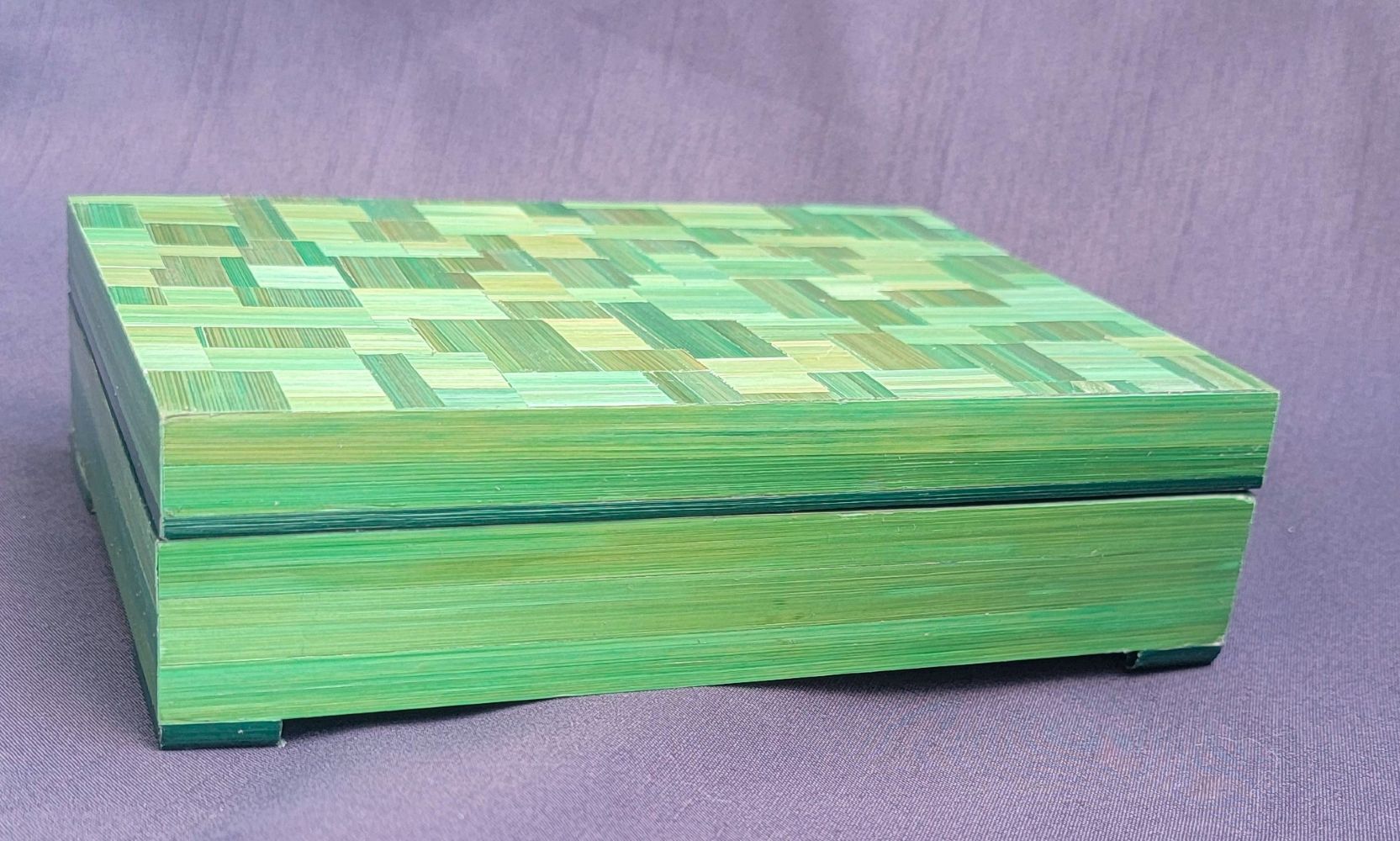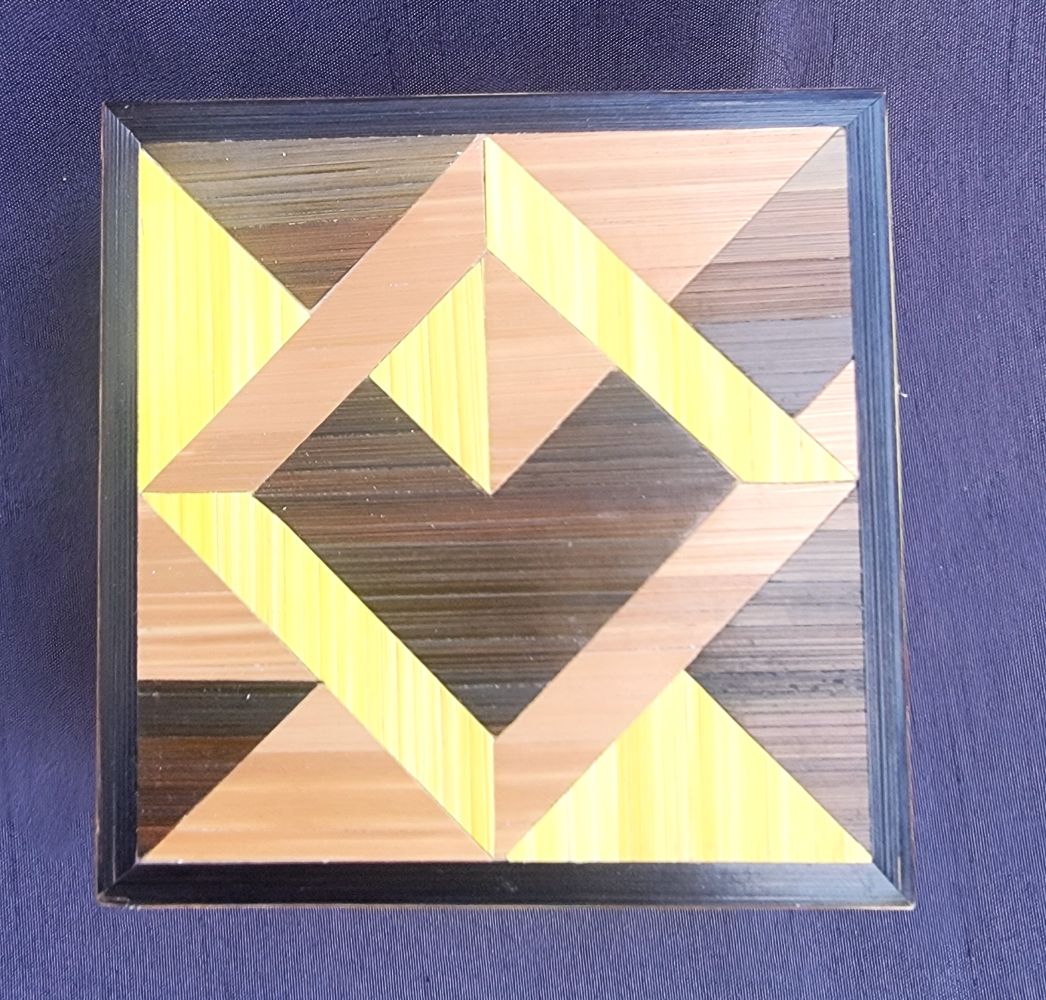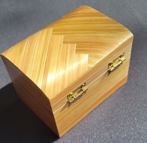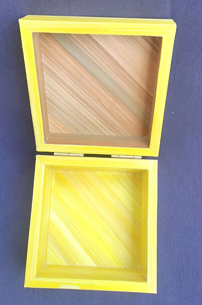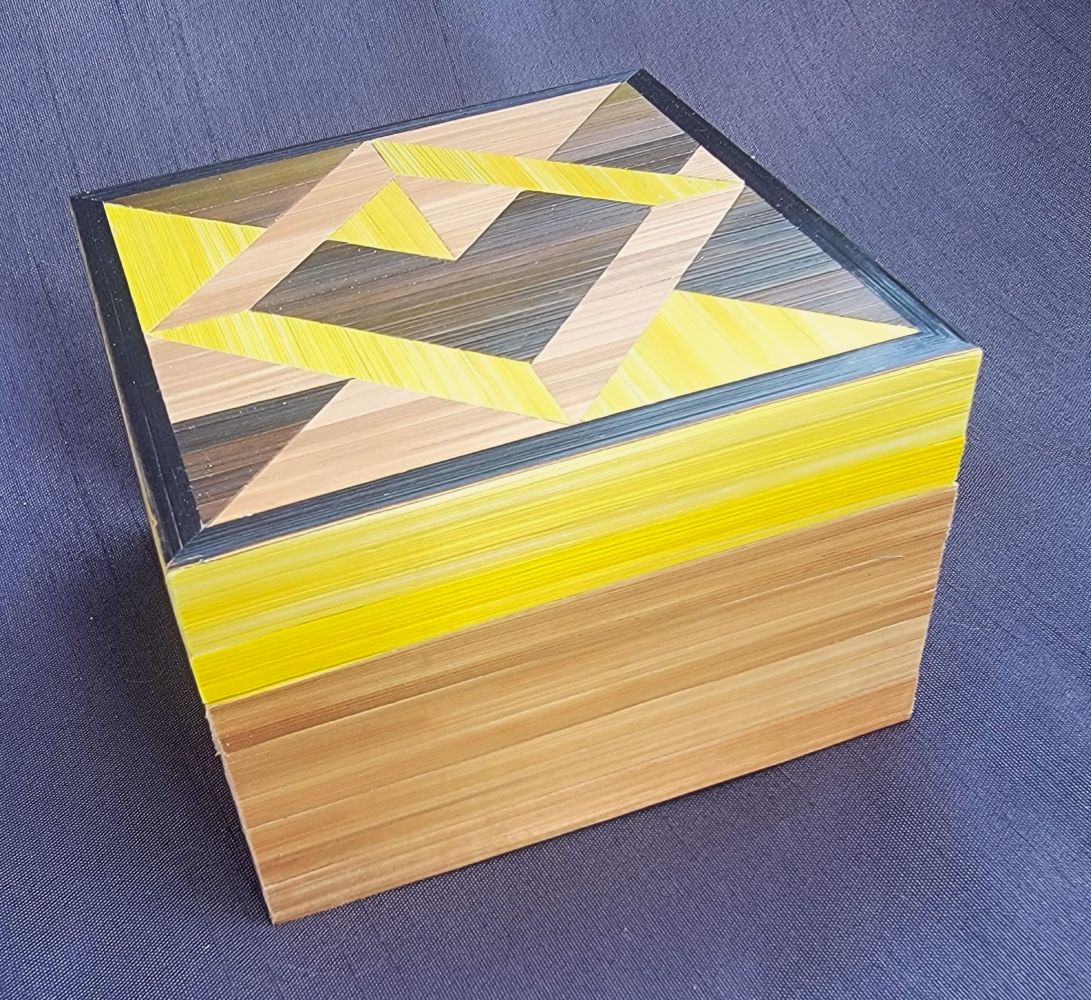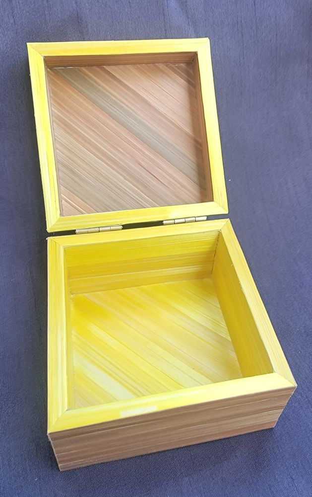 Petite boîte recouverte de marqueterie de rubans cuivré avec un bandeau de dégradé de jaune. Boîte pixélisée.