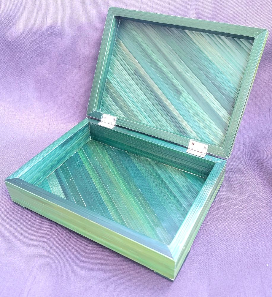 Boîte décorée avec des rubans de couleur verte dans un style très moderne géométrique. De multiples carrés et rectangles imbriqués décorent le couvercle avec des orientations de stries différentes permettant d’avoir des jeux de lumière atypiques.