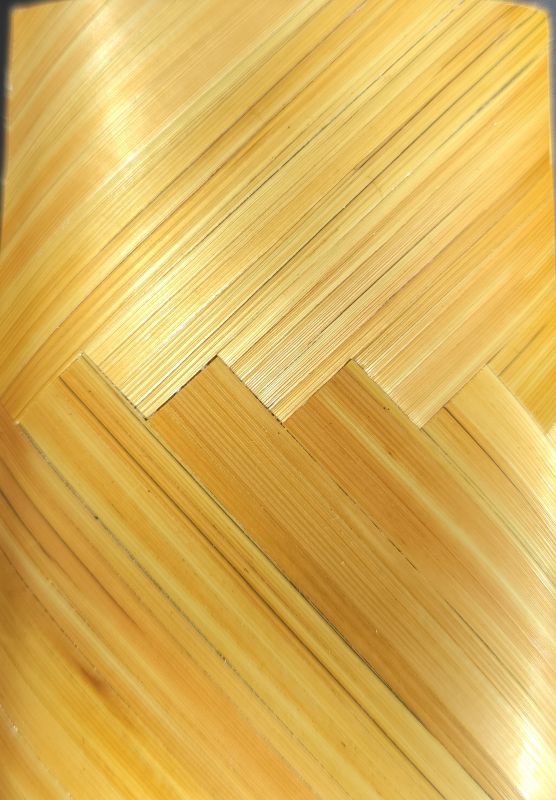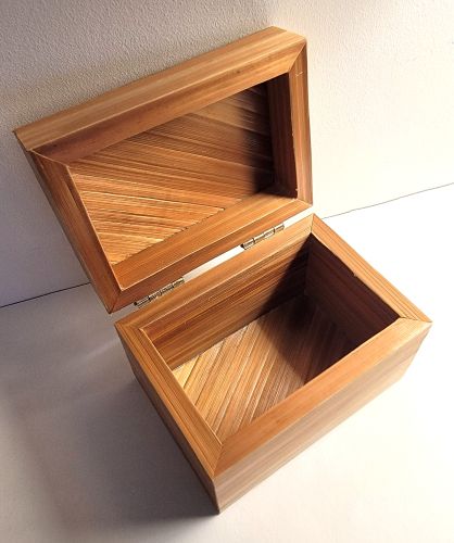 Petite boîte recouverte de marqueterie de rubans marron, beige et jaune, avec un graphisme très tendance et moderne.